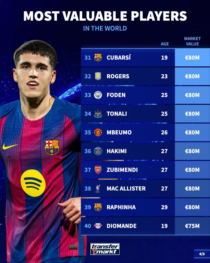 03月30日讯 在更新多个联赛身价后,德转盘点当前足坛身价TOP50。亚马尔、哈兰德、姆巴佩2亿欧领衔,20人身价过亿,意甲仅劳塔罗和伊尔迪兹进入前50。